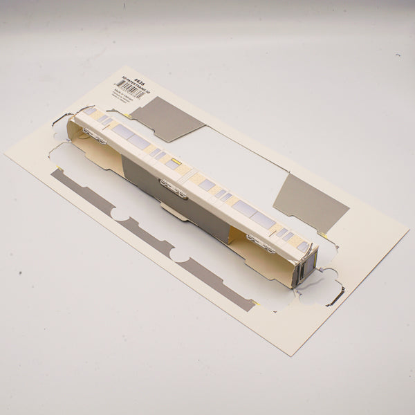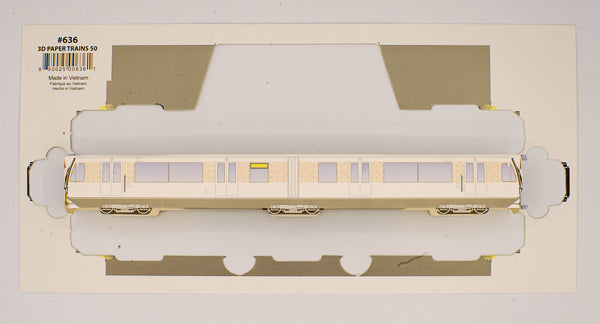 3D Paper Train: #636 Train 50Build your own train with this printed, heavyweight foldable model! Train #636 is primarily white with light grey and pale yellow accents. This train is slightly smaller than the rest of the line. Ships flat and perforated- punch out the design, fold it and insert the tabs to hold. Great for practicing miniature throwies and fills! Assembled size measures approx 7x1.5x2 .